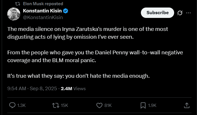 Four days after the murder Elon Musk pointed out that the New York Times had not reported the murder.