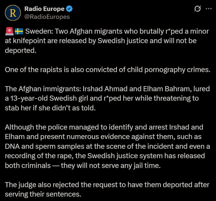 Sweden: Two Afghan immigrants who brutally r*ped a minor at knifepoint are released by Swedish justice and will not be deported.