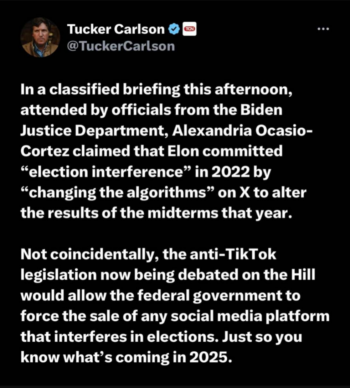 Alexandria Ocasio-Cortez, the “Justice” Department, and Congress are working on legislation that will permit the federal government to force Elon Musk to sell X so that control can be reestablished over the narratives the elites feed us.